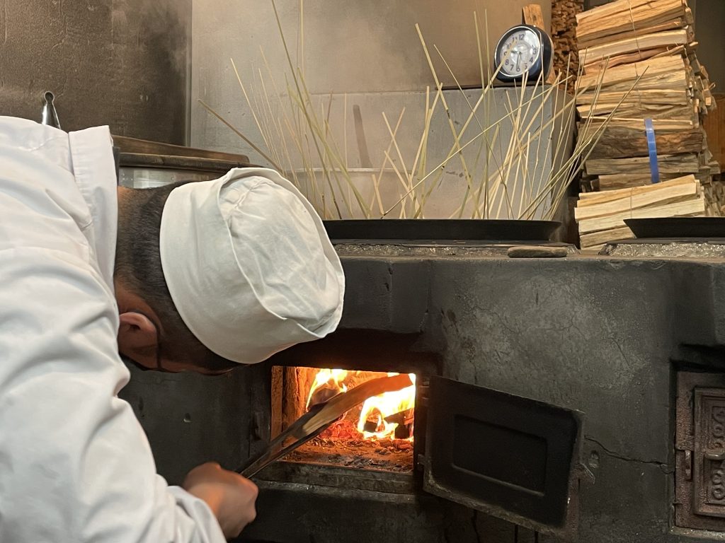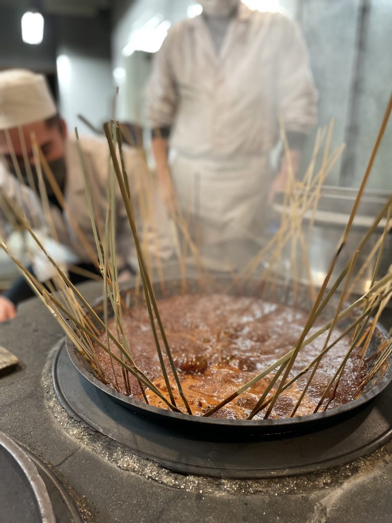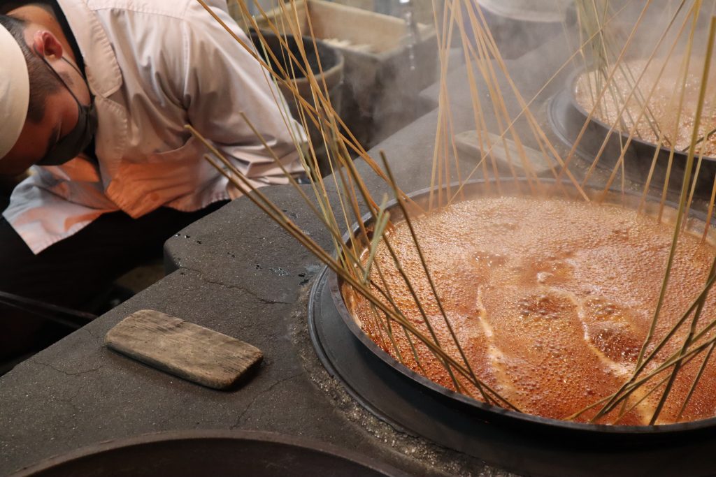 また製造場に入って一番はじめに目につくのは、歴史を感じるかまどである。その上に置かれた鍋はとてもどっしりとしているが、人間が両手で持ち運べるまでの大きさで作られているそうだ。そしてかまどの奥には、大量に積み重ねられた薪が目に入る。鮒佐では昔と変わらず燃料に薪を用いている。薪は火力が強すぎず、弱すぎず、かまどの中で熱が均等に回っているのかがすべてわかるそう。