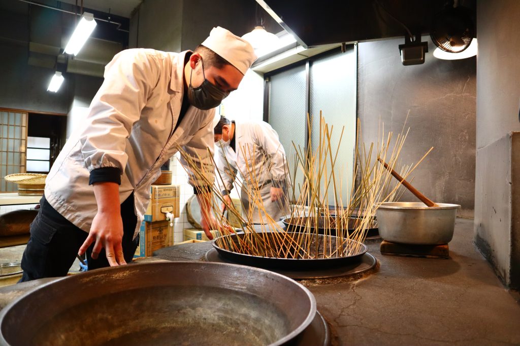 佃煮の作り方は江戸の創業以来ずっと変わらず、初代から一子相伝で受け継いできた。まず鍋の中にタレを入れるところから、佃煮作りははじまる。そして竹製の網を上にのせ、マッチで薪に火をつけた後、様子を見ながらかまどの中に薪を追加していく。火が燃えやすいかどうかは天候によって変わってくるため、実際に火をつけてみなければわからない。